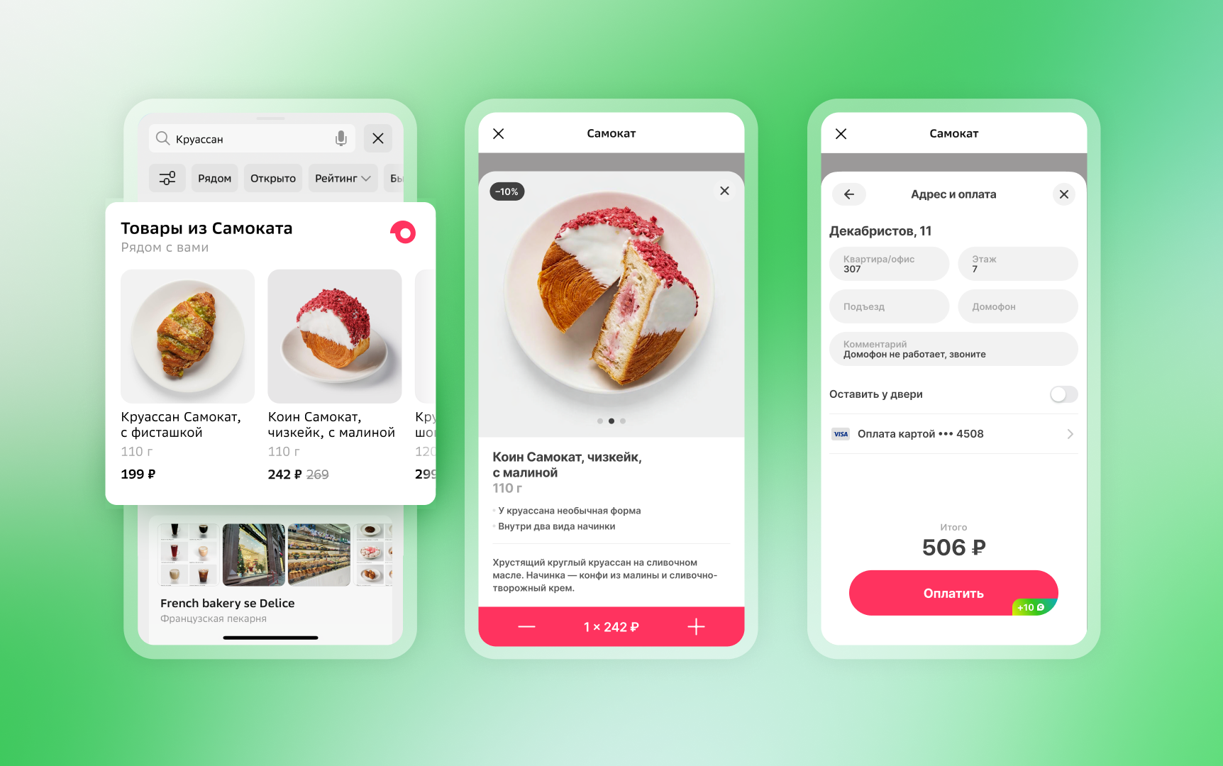 При нажатии на товар открывается веб-приложение Самоката — прямо внутри геосервиса, где можно авторизоваться, добавить товар в корзину и оформить доставку. После закрытия окна пользователь возвращается в 2ГИС — без потери контекста.