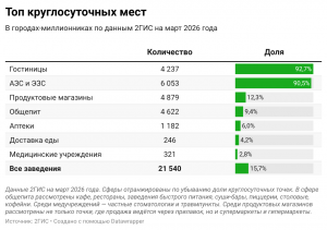 Аналитики рассмотрели семь сфер бизнеса, которые на картах часто ищут не только днём, но и ночью: гостиницы, АЗС и ЭЗС, продуктовые магазины, заведения общепита, аптеки, сервисы доставки еды и медучреждения. За 12 месяцев — с марта 2025 по март 2026 года — количество круглосуточных мест в этих сферах в 16 городах-миллионниках сократилось на 2%.