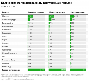 По данным геосервиса 2ГИС, в январе 2026 года в городах-миллионниках России работает около 34,9 тыс. магазинов одежды — женской, мужской и детской. Больше всего таких точек — в Москве (10,5 тыс.), на втором месте Санкт-Петербург с 5,2 тыс. Далее идут Екатеринбург и Новосибирск (по 1,9 тыс.), а замыкает пятёрку Краснодар — 1,8 тыс. магазинов. Также в десятке крупнейших по числу точек — Челябинск, Казань, Самара, Пермь и Нижний Новгород.