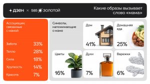 Аналитики выяснили, какие ассоциации у опрошенных вызывает слово «мама». Россияне чаще всего называли заботу (33%) и тепло (28%). Также респонденты выбрали слова «сила» (18%), «хрупкость» (14%) и «красота» (7%). Среди атрибутов, связанных с мамой, опрошенные назвали дом (41%), домашнюю еду (25%), цветы (16%), духи (7%) и варежки (6%) — всё, что так или иначе напоминает о приятных ощущениях, которые возникают рядом с мамой.
