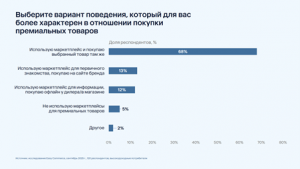 Но еще важнее другое: 68% респондентов готовы знакомиться с товаром и сразу же покупать его прямо на площадке, не переходя на сайт бренда. Это говорит о высоком уровне доверия к маркетплейсам как к каналу для серьезных премиальных покупок.