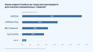 При этом Ozon является безоговорочным лидером по популярности для поиска и покупки премиальных товаров — его отметили 74% опрошенных.