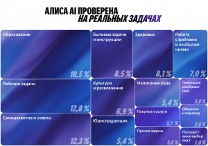 Алису AI обучали на миллионах задач, которые люди каждый день решают с помощью различных нейросетей, ассистентов, Поиска и других сервисов Яндекса. Особое внимание разработчики уделяли практическим задачам — чтобы именно по ним нейросеть выдавала наилучший результат. Алиса AI лучше всех из доступных в России нейросетей отвечает на вопросы в категориях «Образование», «Саморазвитие и советы», «Рабочие задачи», «Бытовые задачи и инструкции» и закрывает все основные потребности в ИИ, которые уже есть или появятся в ближайшем будущем у русскоязычной аудитории.