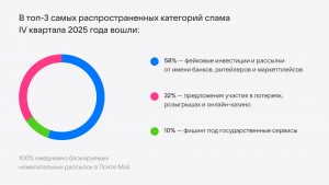 Почта Mail подвела итоги работы антиспам-систем за четвертый квартал и 2025 год. За последние три месяца года сервис заблокировал 7,3 млрд писем со спамом и фишингом. Это на 35% больше, чем за аналогичный период прошлого года. Всего за год сервис заблокировало более 29.6 млрд нежелательных писем.