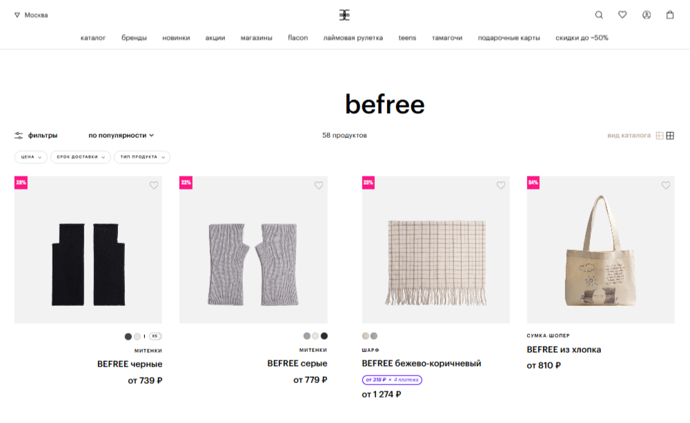 Партнерство с крупнейшим бьюти-ретейлером – следование пути модной экспансии Befree и активной дистрибуции во внешних каналах продаж. За последний год бренд удвоил количество площадок: к Lamoda, Wildberries, Ozon и Яндекс Маркету добавились Авито, Самокат, Магнит Маркет и «Золотое Яблоко». Таким образом, сейчас в портфеле Befree 8 онлайн-партнеров, позволяющим покупателям найти товары Befree в своем любимом канале продаж.