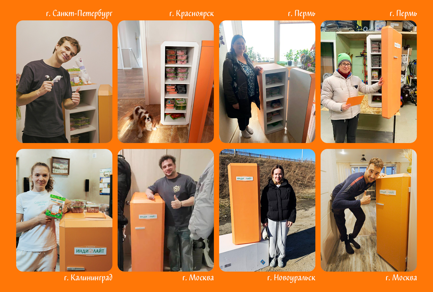 Каждый набор был доставлен в эксклюзивном брендированном холодильнике. Оранжевый холодильник был специально разработан для этого проекта и изготовлен ограниченным тиражом. Внутри него – продукция торговой марки «Индилайт»: стейки, шашлык, филе грудки и филе бедра индейки, различные виды ветчин и сосисок.