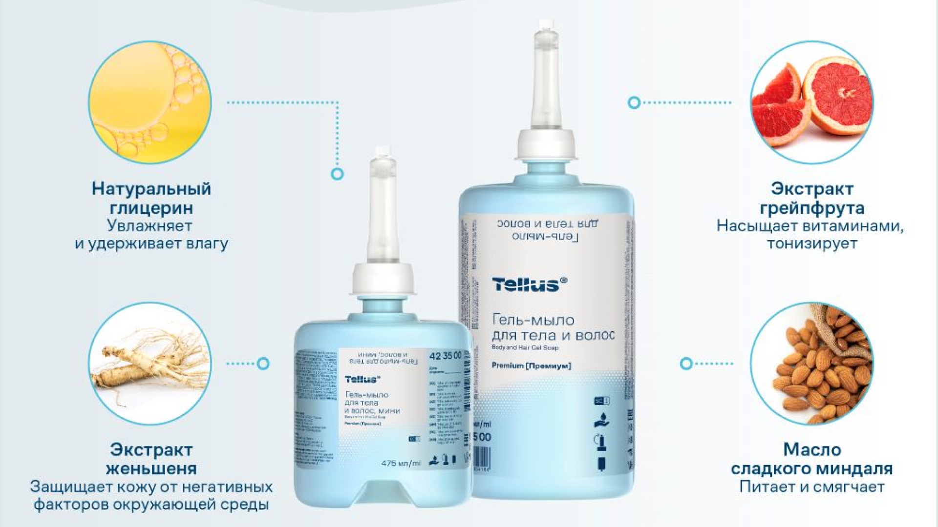 Гель-мыло Tellus для тела и волос — это универсальное решение для сегментов HoReCa, офисных пространств, производственных площадок, образовательных и медицинских учреждений. Продукт помогает повысить уровень комфорта гостей и упростить процесс обслуживания, обеспечивая эффективный и бережный уход за кожей и волосами.