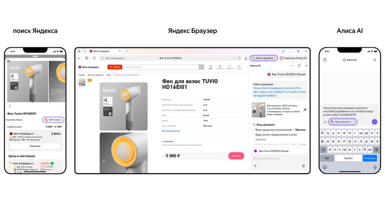 Для поиска выгодных предложений с помощью ИИ покупатель может отправить ссылку на товар в приложении Алиса AI, веб-версии чата с нейросетью или приложении Яндекс с Алисой AI. Находить товары по выгодным ценам также можно на ПК в Браузере: достаточно открыть интернет-страницу с товаром, и кнопка «Найти дешевле» появится рядом с адресной строкой. Обратиться к ИИ пользователи могут и в Поиске — по кнопке «Найти скидку» в карточке товара.