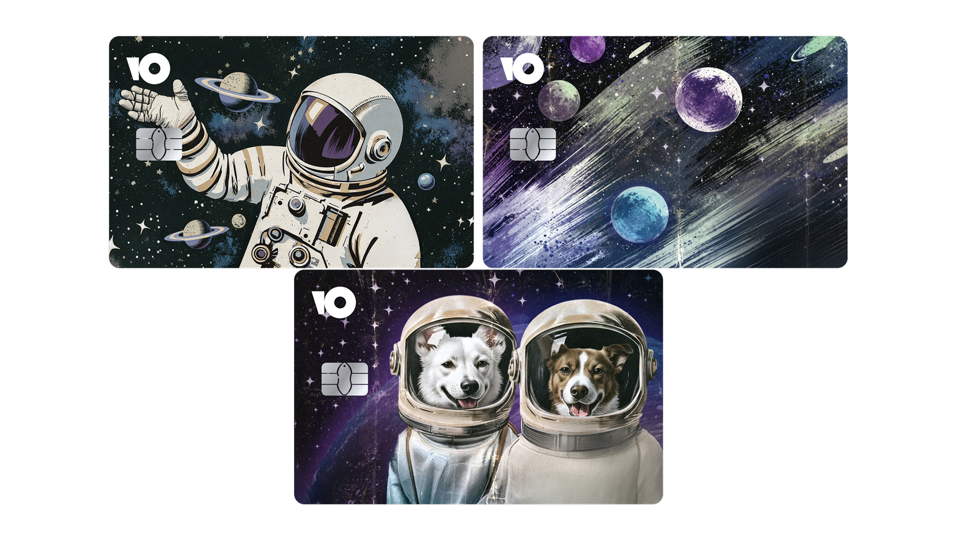 - ЮMoney выпустили три пластиковые карты с уникальным дизайном ко Дню космонавтики — с изображением парада планет, Белки и Стрелки и космонавта.