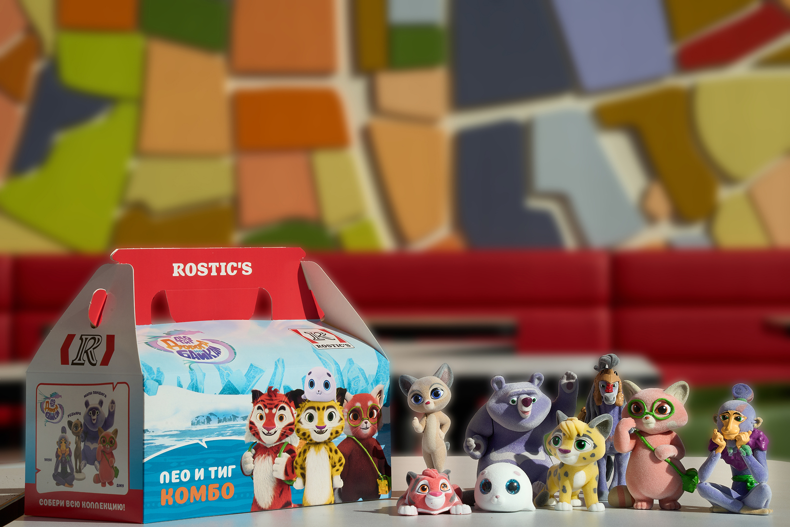 21 апреля в сети ресторанов быстрого обслуживания ROSTIC’S появилось новое комбо с персонажами мультфильма «Лео и Тиг». В коллекцию вошли 8 уникальных героев: леопард Лео, тигренок Тиг, нерпа Луфи, медведь Мапа Пандига, конь Тенгри-Хан, обезьяна Укун, панда Джу и рысь Редьяра.