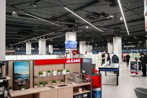 Новая концепция направлена на создание комфортной и интуитивно понятной среды для покупателей. Магазин общей площадью 2200 кв. м выполнен в полностью обновленном фирменном стиле М.Видео: с акцентным красным цветом, современными графическими элементами и тщательно продуманным зонированием пространства. Функциональная архитектура магазина позволяет клиентам легко ориентироваться в пространстве и быстро находить необходимые товары и сервисы. Особое внимание уделено удобству и клиентоориентированности — от внутренних маршрутов до дизайна отдельных зон.