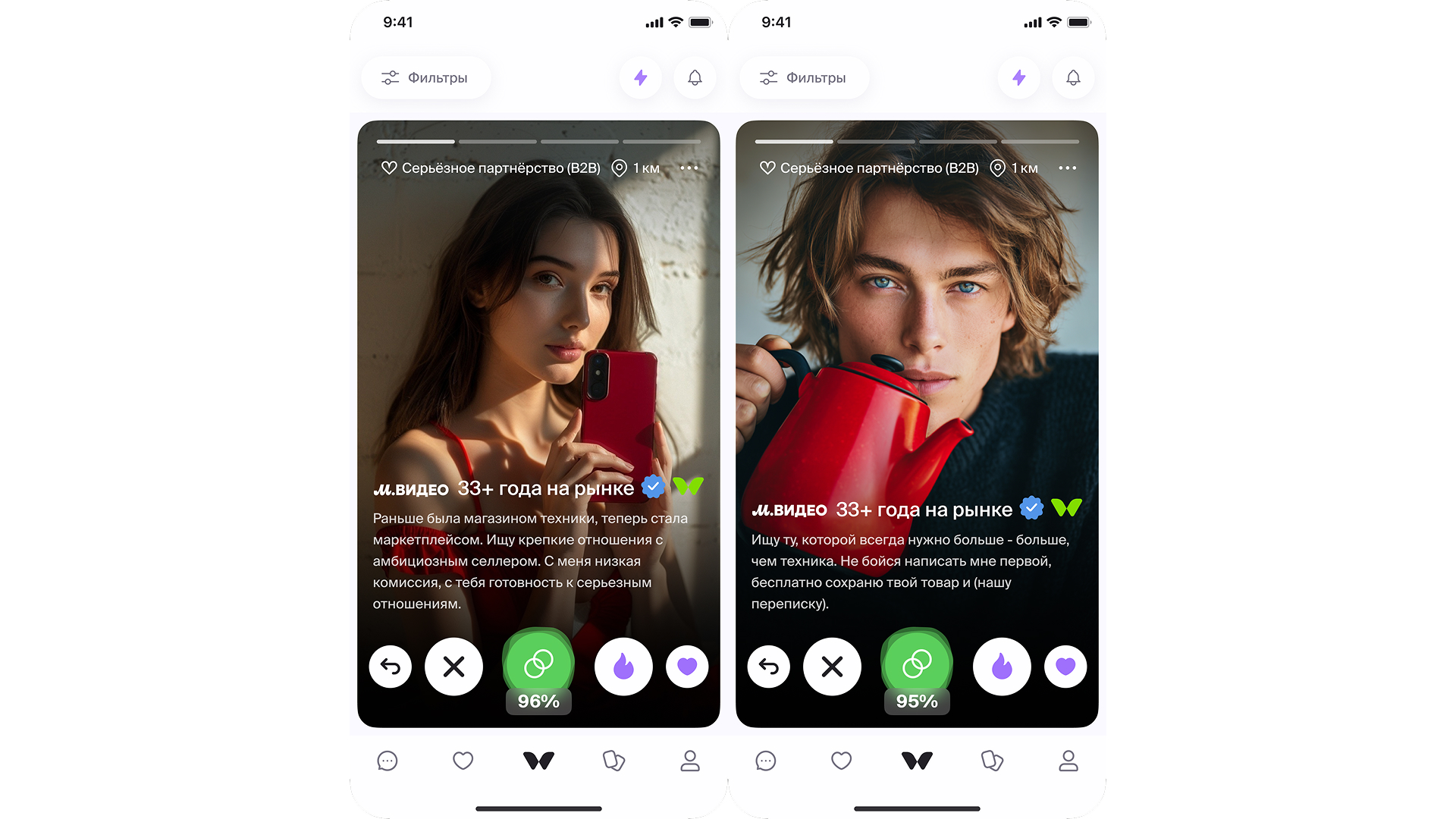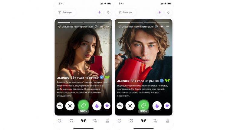 В рамках проекта М.Видео представлена в Twinby в формате бренд-профиля, стилизованного под классическую анкету пользователя сервиса знакомств. Компания «рассказала о себе» языком платформы: «33 года на рынке, в активном поиске, цель — серьезное партнерство». Формат позволил сохранить официальный характер предложения, при этом органично вписаться в механику дейтинг-сервиса.