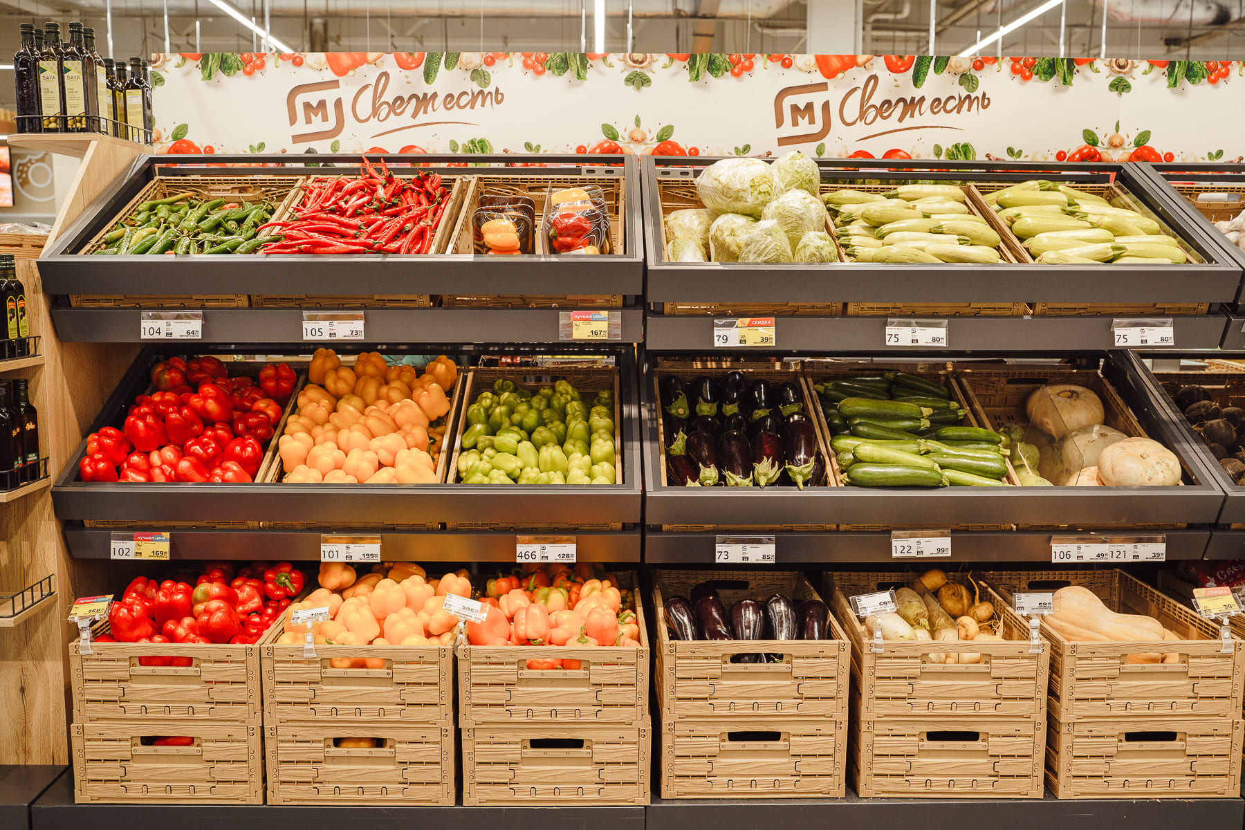 В магазинах фермерская продукция размещается на отдельных полках и витринах. Например, в супермаркетах и суперсторах розничной сети такой ассортимент представлен на витринах «Фермерская корзинка».