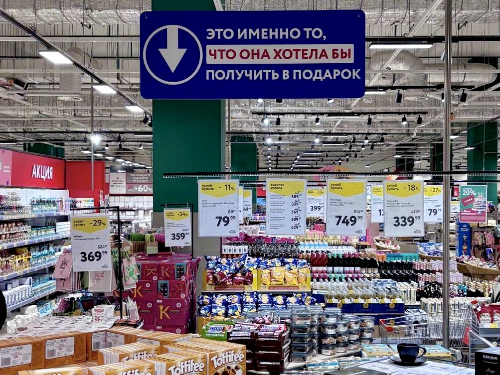 В гипермаркетах появились визуальные подсказки с дружелюбными и ироничными надписями: «На этих полках стоит поискать подарок», «Начало участка с отличными закусками к столу», «Парковка разрешена. На этих полках можно найти приятный подарок». Так бренд обозначил ряды с цветами, кондитерскими изделиями, закусками, товарами для дома и интерьера и другими популярными категориями к празднику.