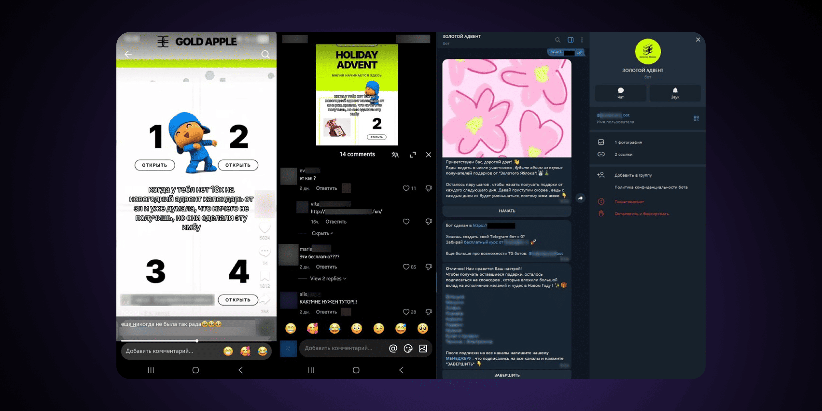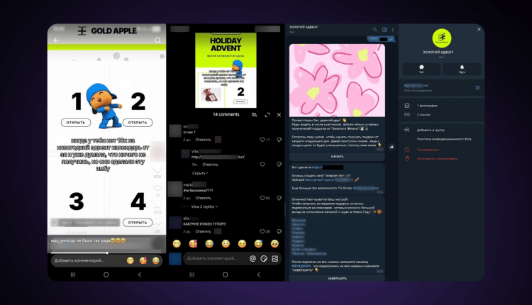 Вот как это работало. Через угнанные или новые аккаунты в TikTok распространялись видеоролики, анонсирующие «акцию» и предлагающие перейти по ссылке в комментариях или в профиле. Оттуда пользователей вели на сайт, визуально похожий на официальный ресурс ретейлера: там человеку предлагали открывать ячейки адвента и получать «гарантированный приз». Чтобы его получить, нужно было перейти в телеграм-бот, который был точкой управления: собирал аудиторию, навязывал подписки или переводил пользователя на дальнейшие действия вплоть до передачи своих персональных данных или платежей в пользу мошенников.