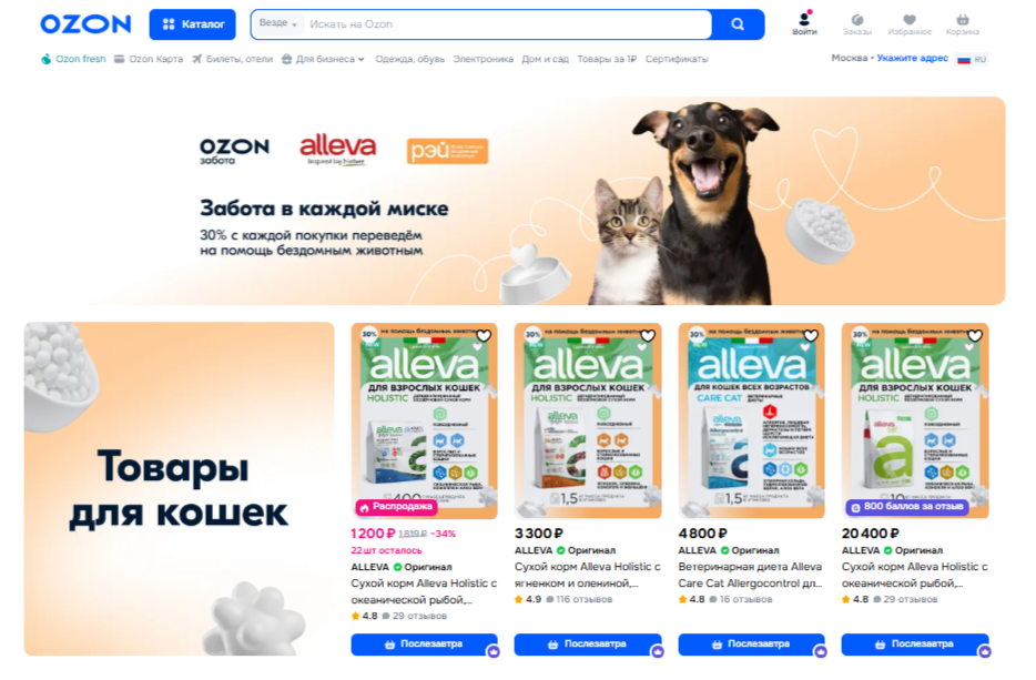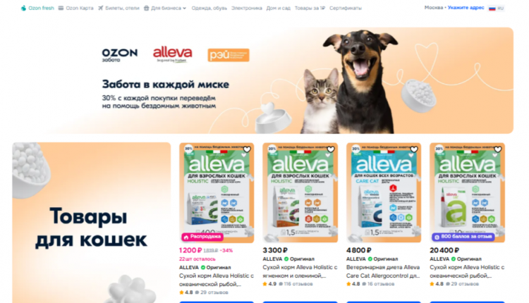 До 13 ноября пользователи маркетплейса могут поддержать подопечных фонда «РЭЙ», бездомных собак и кошек, просто делая покупки на платформе. Для этого Ozon Забота в партнёрстве с брендом Alleva создали специальную витрину. На ней можно выбрать и приобрести для своих питомцев натуральные корма со сбалансированным составом, а 30% с каждого товара будут направлены в фонд в пользу животных, у которых пока нет настоящего дома.