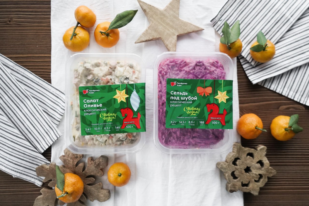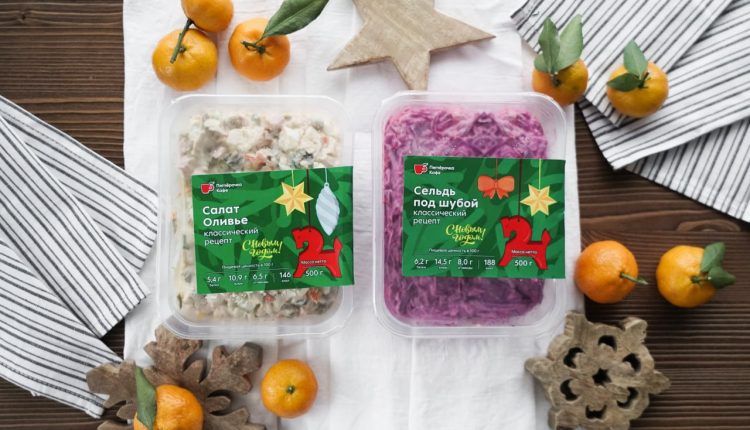 Традиционные блюда новогоднего стола – оливье, крабовый салат и сельдь под шубой — также будут обновлены к праздничным дням. Их упаковки украсят новогодние элементы, а, помимо стандартного объёма (200 гр.), на полки встанут салаты в семейном формате по 500 гр.
