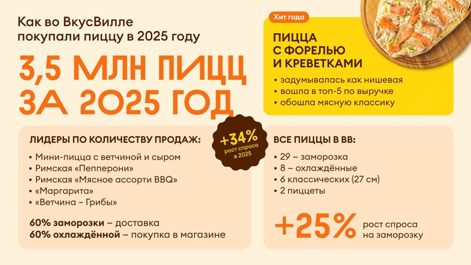 Накануне Международного дня пиццы, который отмечается 9 февраля, ВкусВилл провёл исследование потребительских предпочтений и подвёл итоги категории за 2025 год. Выяснилось, что за прошлый год покупатели приобрели почти 3,5 миллиона штук замороженной и охлаждённой пиццы, а общая динамика спроса в натуральном выражении выросла на 34%.