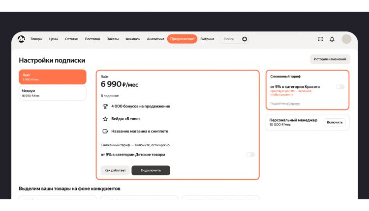 • Лайт: 6 форматов дополнительной подсветки магазина на Маркете и внутри витрины (например, бейдж «В топе» для магазинов с высоким рейтингом). А также 4000 бонусов на востребованный инструмент продвижения — буст показов. Стоимость подписки: 6990 руб. в месяц.