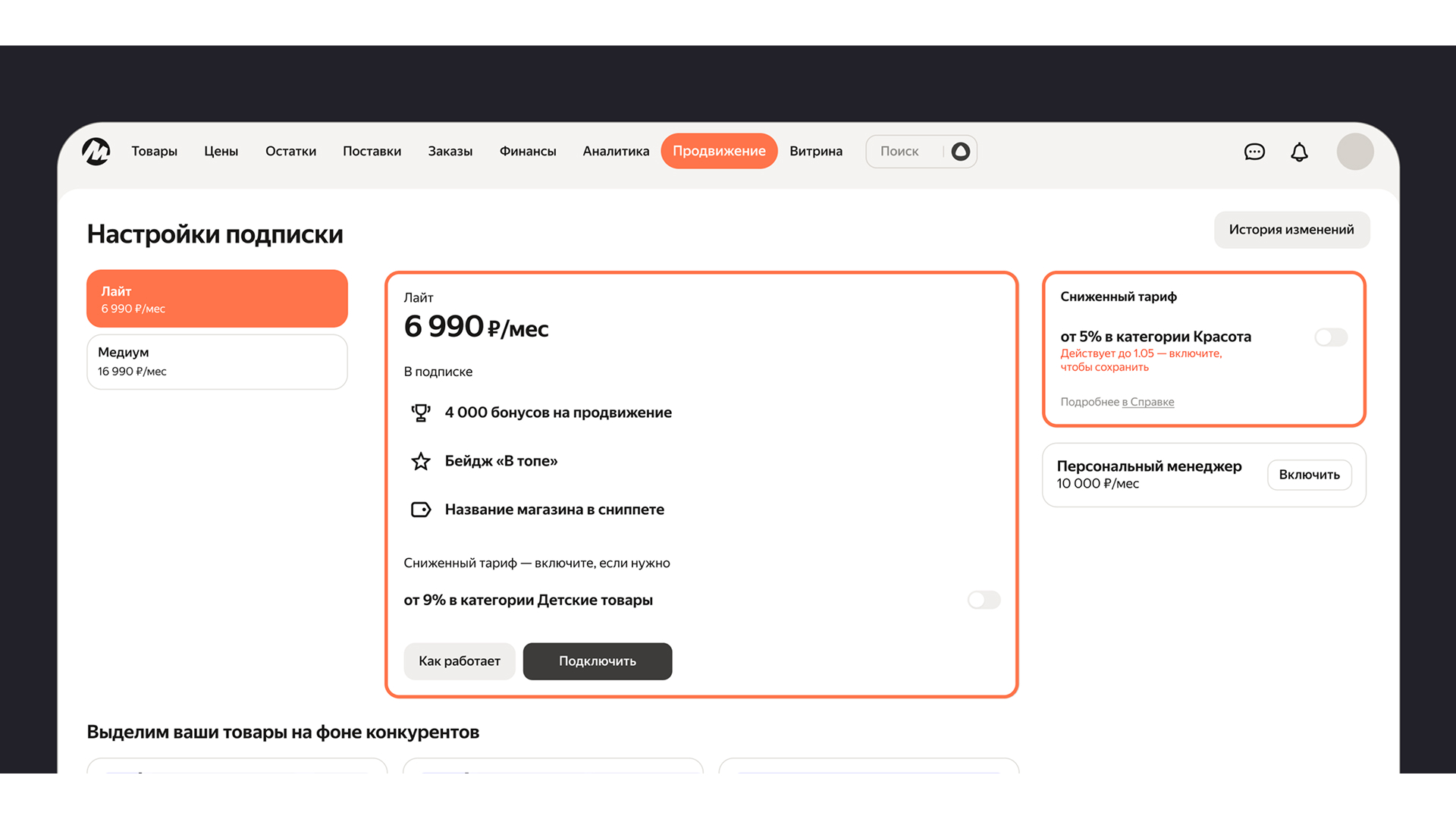 • Медиум: те же форматы подсветки магазина, но почти в 2 раза больше бонусов на продвижение — 9000. А также приоритетную поддержку и расширенные лимиты для работы через API Маркета — они пригодятся продавцам с большим ассортиментом, которые автоматизируют работу с товарами. Стоимость подписки: 16990 руб. в месяц.