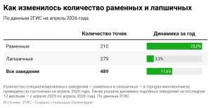 По данным 2ГИС, за последний год — с апреля 2025 по апрель 2026 года — в городах‑миллионниках число заведений формата раменных и лапшичных выросло на 12% (до почти 500 точек). Сильнее всего растут раменные: за год их стало больше на 25%. Количество лапшичных выросло на 3%.