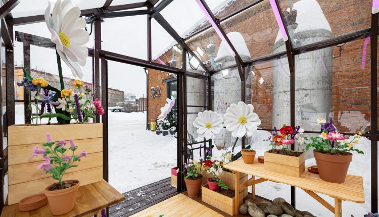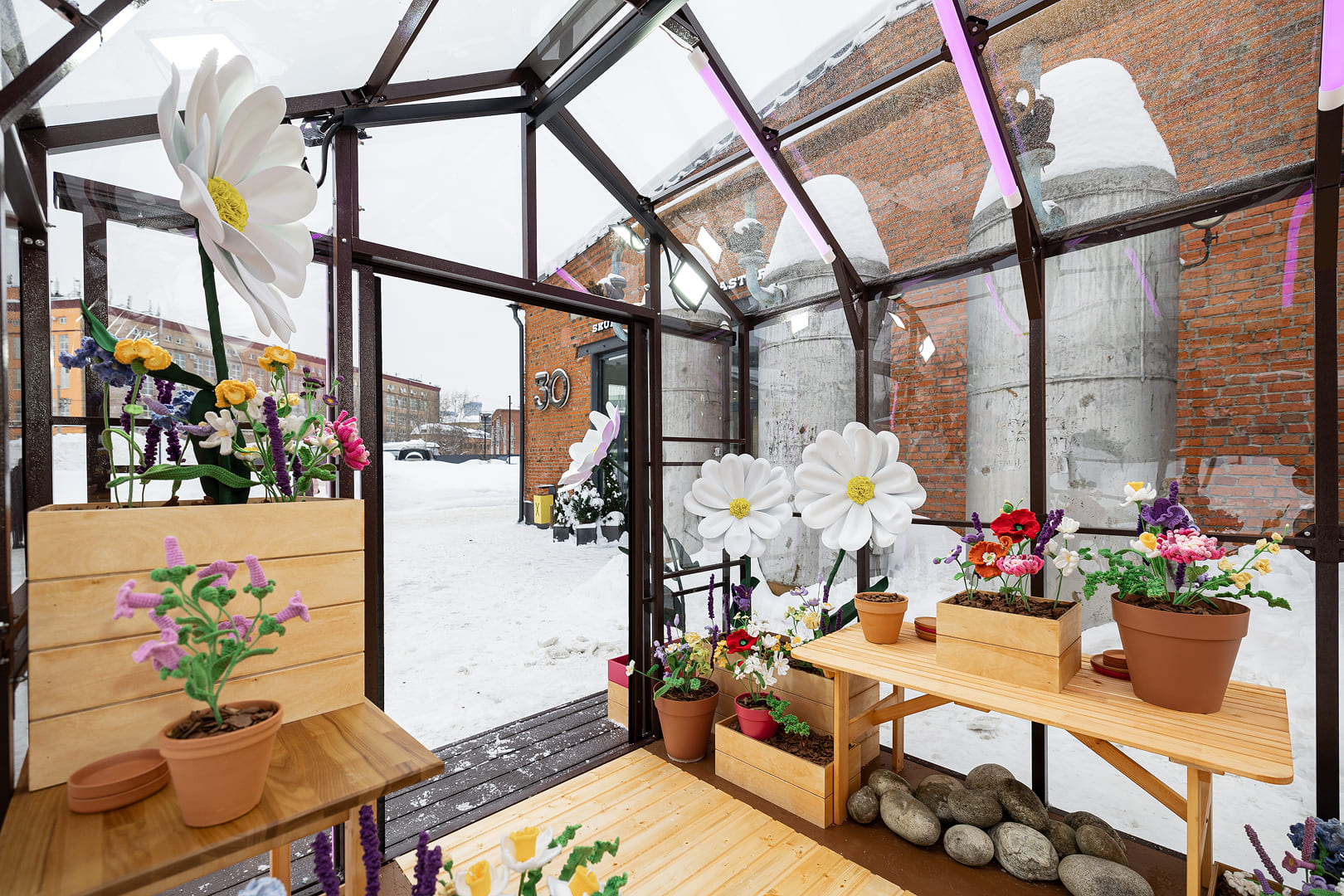 Офлайн-частью проекта стала теплица, установленная на Хлебозаводе №9 в Москве. Арт-объект будет открыт для посещения и задуман как точка притяжения горожан: внутрь можно зайти, рассмотреть вязаные цветы вблизи и сделать фотографии.