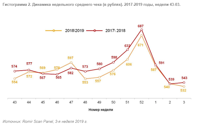 При этом индекс среднего чека, наоборот, третью неделю продолжает снижаться. Он получил значение в 532 руб., что на 1,5% ниже, чем неделей ранее. На аналогичной неделе прошлого года индекс среднего чека был выше на 2%. По сравнению с медианными значениями 2012 года средний чек 3-й недели текущего года вырос на 66,3%.
