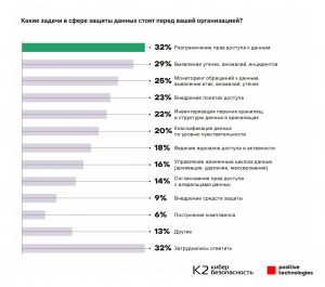 Среди главных задач в области защиты данных респонденты выделили разграничение доступов (32%); обнаружение утечек, аномалий и инцидентов (29%); мониторинг обращений к данным и выявление атак (25%).