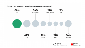 Исследование показало, что DLP-системы остаются доминирующим инструментом для защиты данных (64%), это подтверждает их ключевую роль в предотвращении утечек и контроле передачи конфиденциальной информации. PAM-системы используют 42% опрошенных, что говорит о продолжающемся фокусе на управлении привилегированным доступом, но с некоторым сдвигом в расстановке приоритетов. За ними следуют DAM/DBF (36%), что свидетельствует о стабильном внимании к мониторингу и защите баз данных. Меньше трети компаний используют более сложные и молодые решения: DRM (23%), VDR (15%) и DCAP/DAG (15%). ILD применяют реже других — 12%, что может говорить о более зрелом или нишевом их использовании.