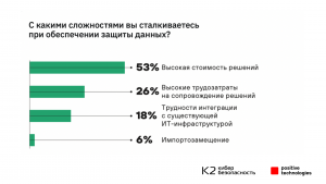 Основными проблемами при защите данных респонденты назвали высокую стоимость (53%) и трудозатраты на сопровождение стека решений (26%), сложную интеграцию с существующей ИТ-инфраструктурой (18%) и вызовы импортозамещения (6%).