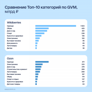 По данным Easy Commerce за 1 полугодие 2025 спортивные товары стабильно входят в топ-10 категорий по объему продаж на Wildberries (4-е место с GMV 238 млрд руб.) и Ozon (8-е место, с GMV  147 млрд руб.). Оборот в категории спорттовары на Wildberries вырос на 44%, а на Ozon — на 40%.
