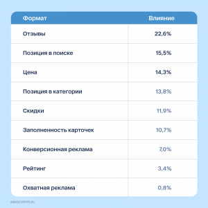 3. Фокус на карточку и отзывы. 33,3% успеха зависят от этого. Прорабатывайте визуал, описания, характеристики и профессионально работайте с обратной связью — это снизит затраты на рекламу.