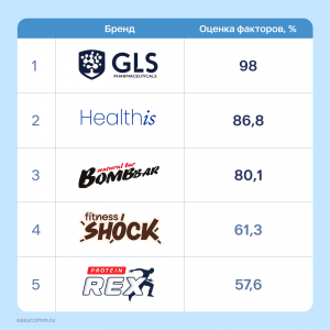 По результатам расчетов в категории спортивного питания мы выявили сильную корреляцию комплексной оценки с продажами: чем выше оценка бренда по факторам, тем с бОльшей вероятностью бренд попадает в топ категории по GMV.