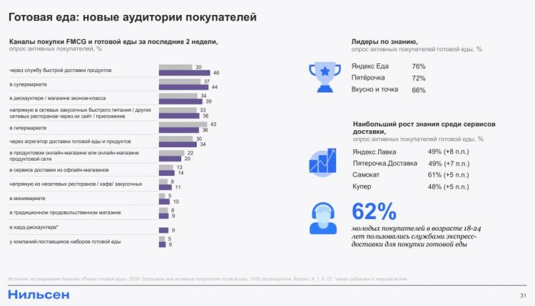 По данным свежего опроса Нильсен, на рынке готовой еды сменился лидер среди каналов, где респонденты чаще всего приобретали готовую еду. Среди тех покупателей, которые активно приобретают такие продукты, впервые на первое место вышли сервисы быстрой доставки продуктов, например, «Яндекс Лавка», «Самокат» и подобные. Их в качестве канала покупки выбрали 46%, что на 16 п.п. больше, чем в прошлом году.
