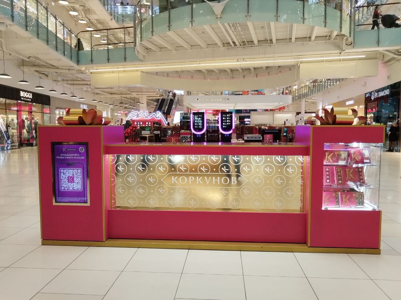 На протяжении десятилетий бренд «Коркунов» ассоциируется с атмосферой праздника, а фирменная коробка бренда — настоящий комплимент тому, кто важен. Корнер в Авиапарке стал отражением этой философии: пространство в фирменных бордово-золотых оттенках дополняют объемные декоративные конфеты, создающие эффект шоколадной витрины. Здесь гости могут познакомиться с особой коллекцией конфет «Коркунов» ручной работы, которая не входит в основной ассортимент бренда.