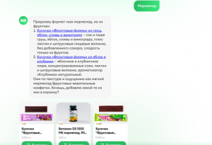 При этом бот не просто выдаёт первый попавшийся результат. Он уточняет предпочтения: спрашивает, какой именно вариант ближе — шоколадный, ореховый, фруктовый, с меньшим количеством углеводов или без сахара. И уже после этого предлагает конкретный продукт с разбором состава.